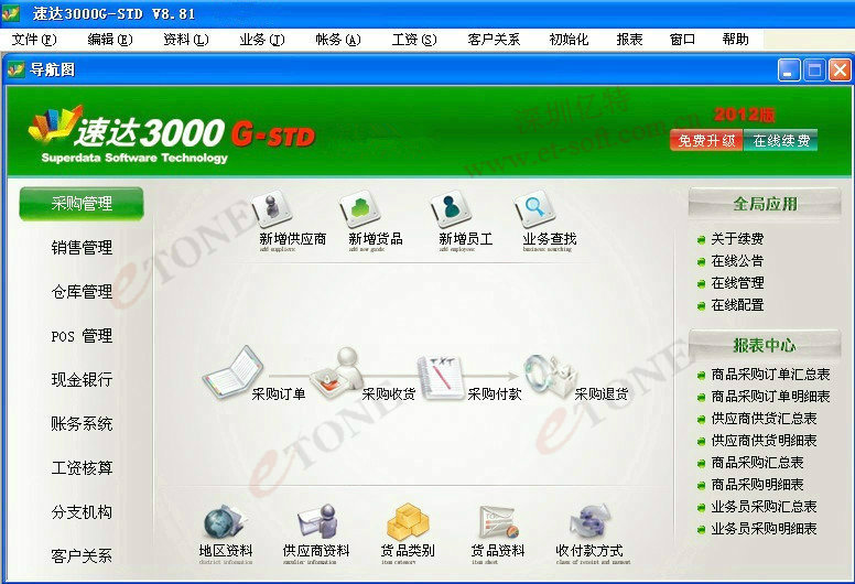 《速達3000 G-STD 》是一款集進銷存、財務、POS、CRM為一體的集成化企業信息管理系統。軟件界面簡潔,功能完善,有效幫助企業處理日常經營管理業務,協調業務流轉過程。系統融入新 一代全局應用技術,支持互聯網/局域網多用戶應用,支持異地多機構、多店面、多倉庫遠程應用,支持數據實時同步管理和移動辦公,安全穩定、高速,易實施維護,特別適合中小企業使用 。