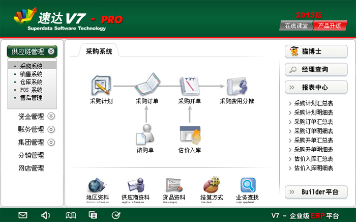 《速達V7-PRO-商業版》作為高端ERP管理平臺,特別適合大中型企業使用。平臺全面實現供應鏈業務管理、資金管理、財務管理、客戶關系管理、人力資源管理、辦公管理、異地分銷、遠程配送、多機構集團化管理。平臺通過強化業務流程控制,多級審批管理,有效地幫助企業實現業務管理、財務管理的制度化。平臺科學地融入Builder-Ⅲ二次研發工具,真正實現了產品平臺化,滿足企業管理個性化需求,全面提升企業管理的能力。